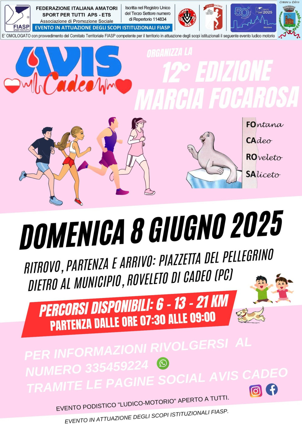 L'Avis di Cadeo organizza, per domenica 8 giugno, la 12ª edizione della Marcia FocaRosa, evento podistico "ludico-motorio" aperto a tutti.