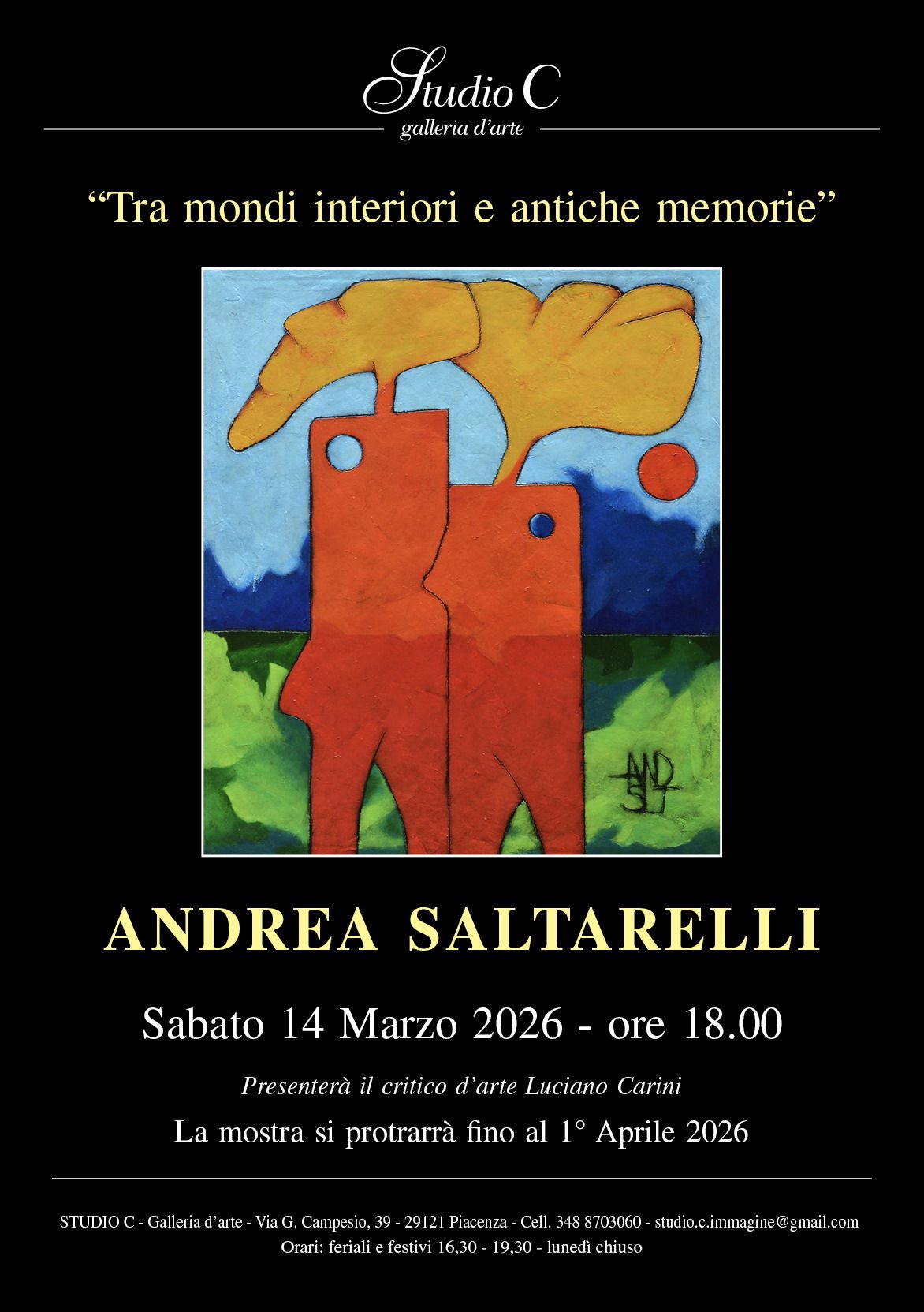 Sabato 14 marzo alle ore 18.00, la Galleria d’Arte Contemporanea Studio C di Piacenza inaugura la mostra personale di Andrea Saltarelli, dal titolo “Tra mondi interiori e antiche memorie”.