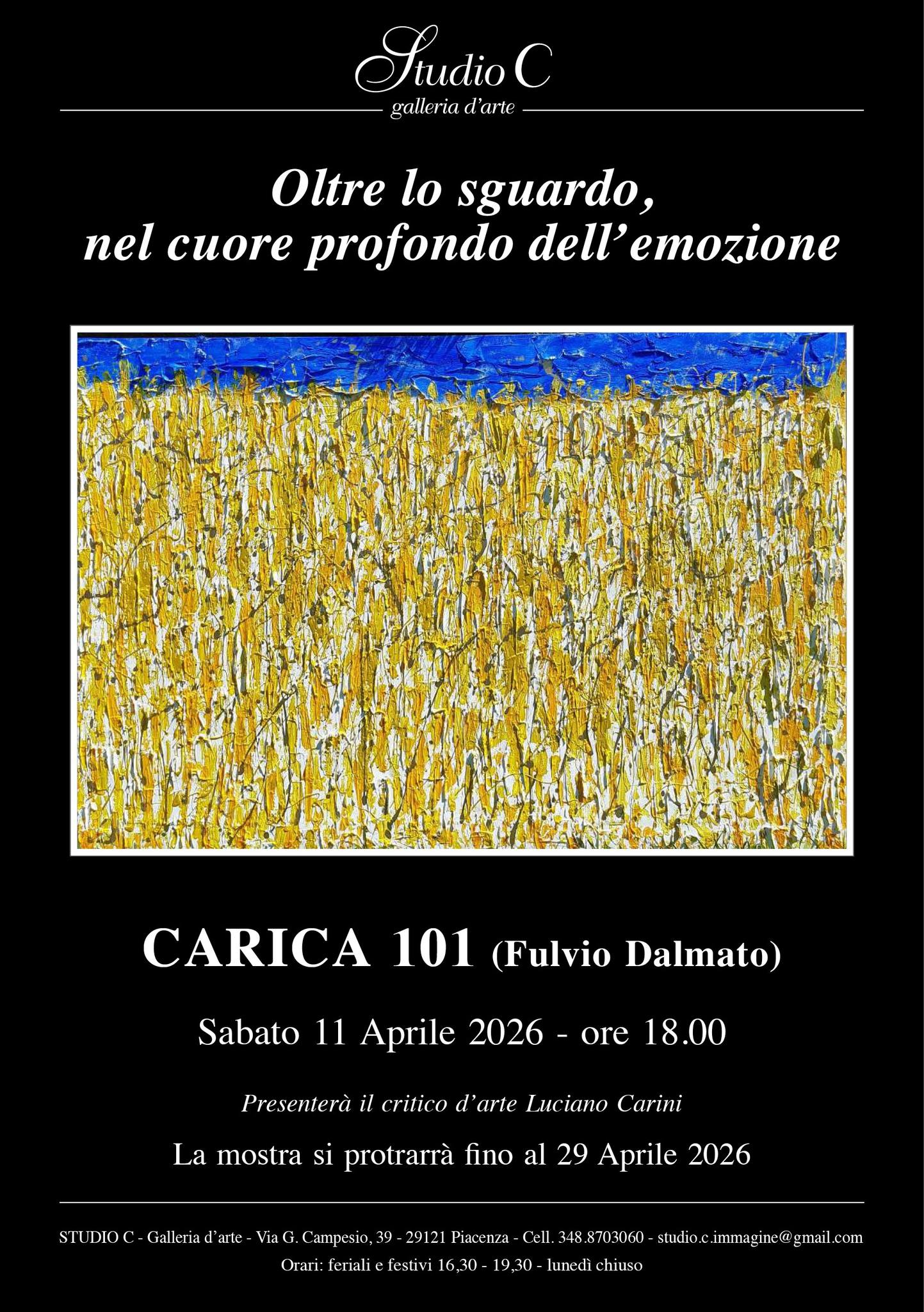 Sabato 11 aprile alle ore 18.00, la Galleria d’Arte Contemporanea Studio C di Piacenza inaugura la mostra personale di CARICA 101 (Fulvio Dalmato) dal titolo “Oltre lo sguardo, nel cuore profondo dell'emozione”.