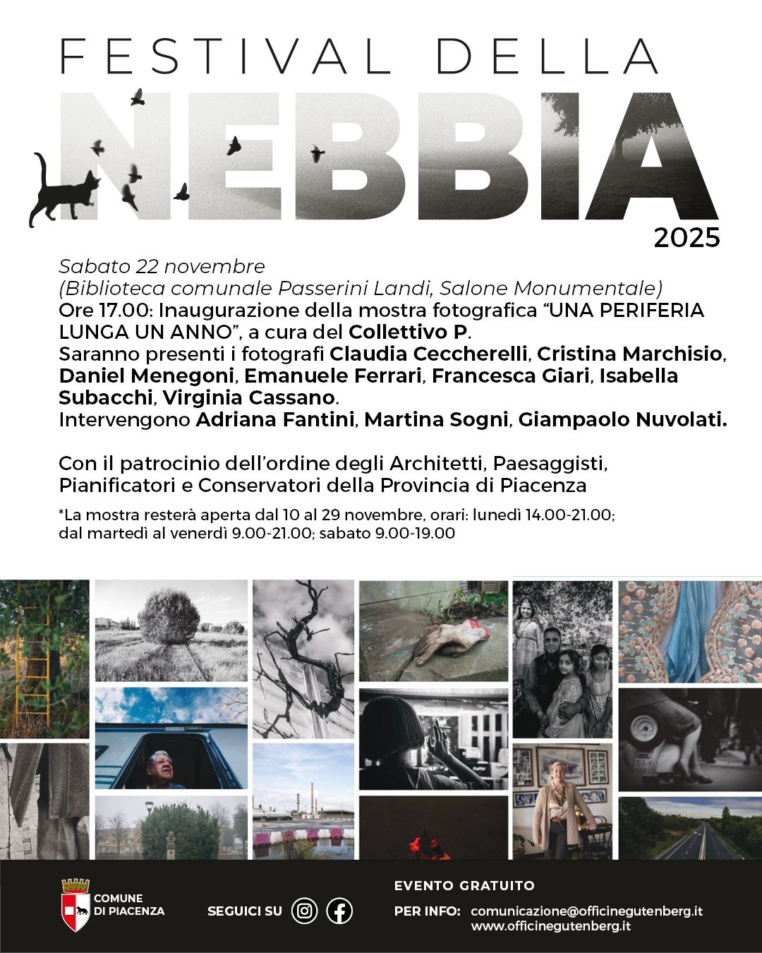 Sabato 22 novembre, alle ore 17.00, il Salone Monumentale della Biblioteca Passerini-Landi ospiterà l’inaugurazione della mostra fotograficaUna periferia lunga un anno, a cura del Collettivo P., nell’ambito del Festival della Nebbia 2025.