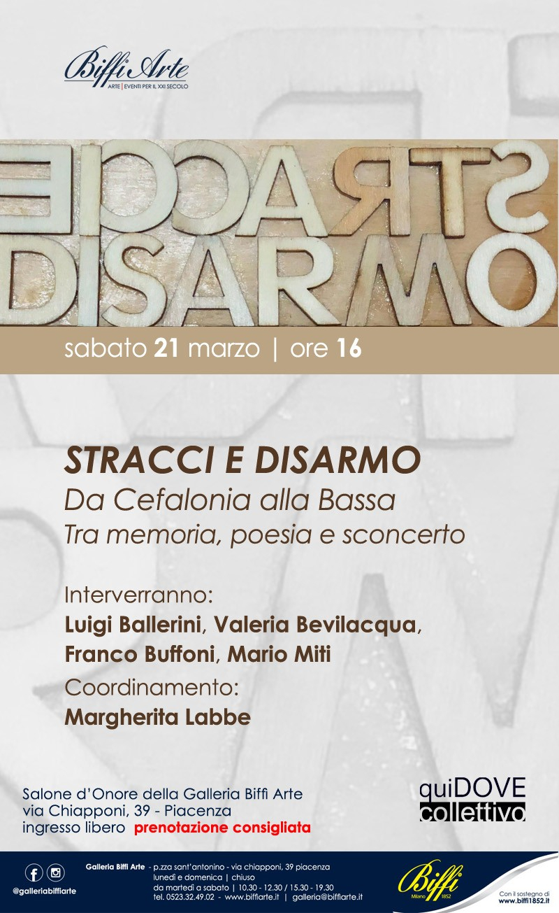 Sabato 21 marzo alle ore 16.00, nel Salone d’Onore della Galleria Biffi Arte, si tiene l’incontro "Stracci e Disarmo. Da Cefalonia alla Bassa: tra memoria, poesia e sconcerto", a margine della mostra del collettivoquiDOVE.