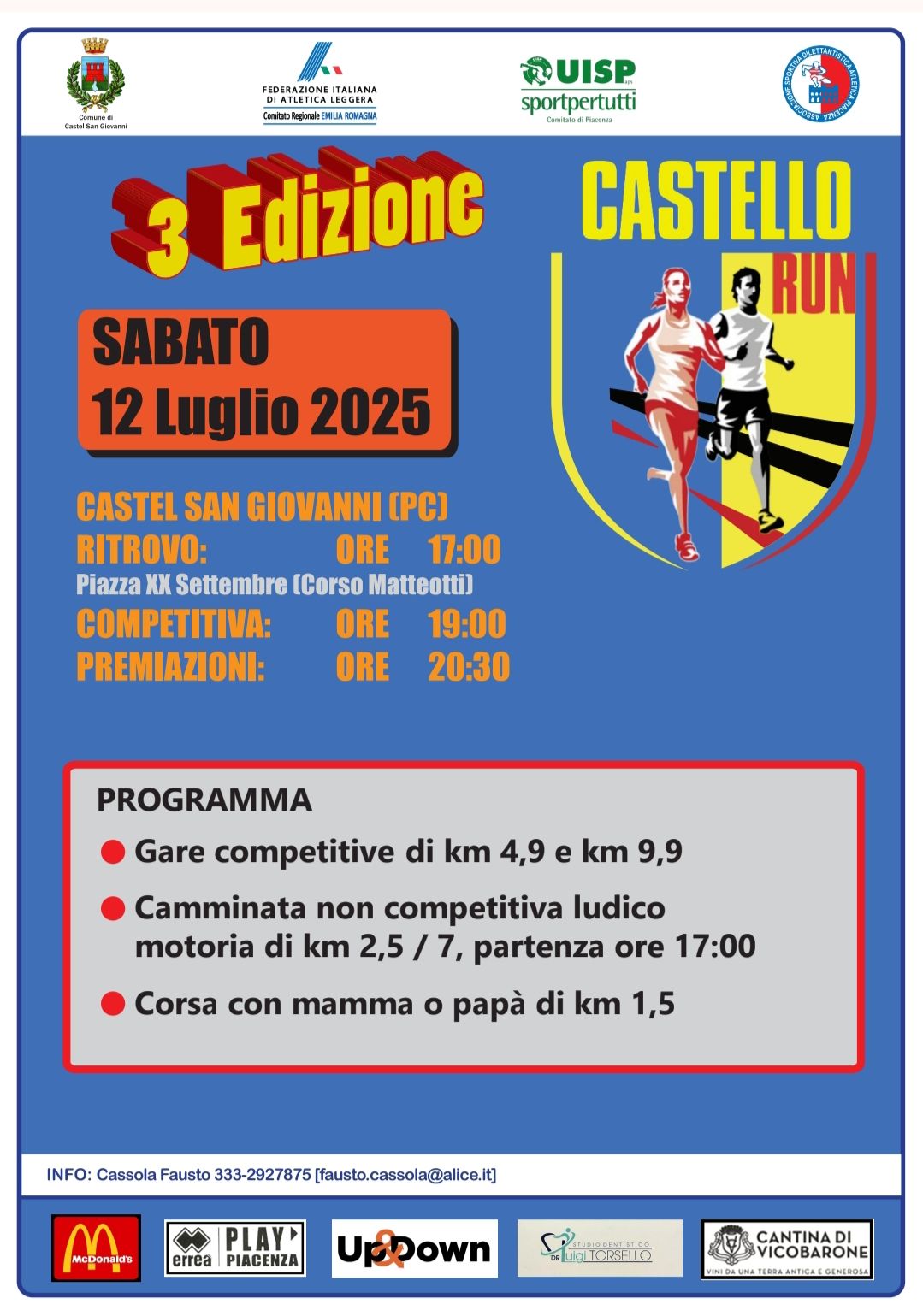 Sabato 12 luglio a Castel San Giovanni si terrà la terza edizione della Castello Run, manifestazione sportiva aperta a tutti.