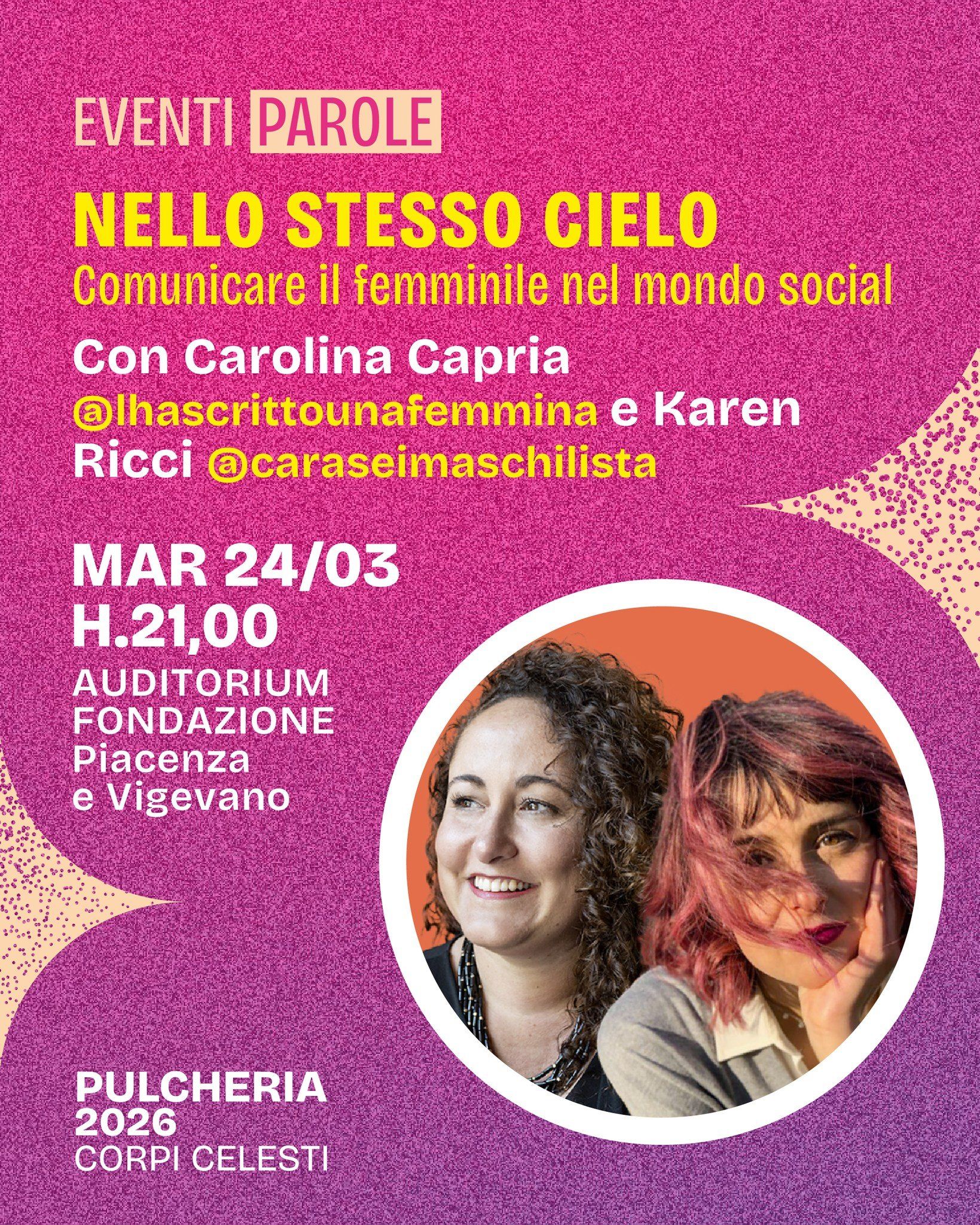 Martedì 24 marzo alle ore 21.00, all’Auditorium della Fondazione di Piacenza e Vigevano,Pulcheria 2026 propone l’incontro "Nello stesso cielo. Comunicare il femminile nel mondo social".