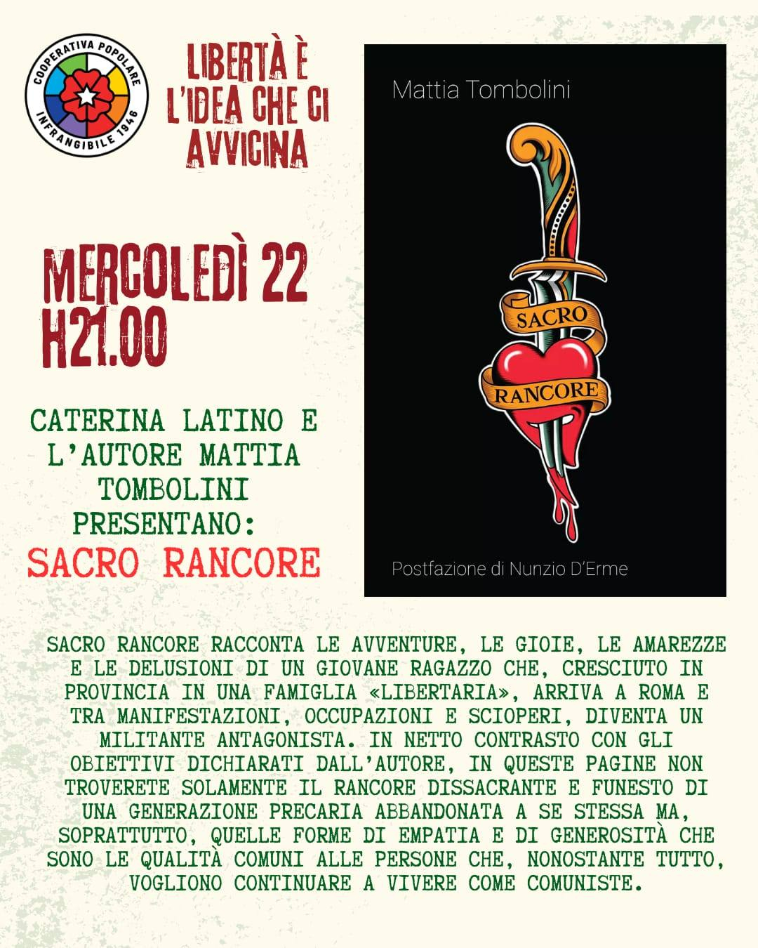 - Presentazione del libro Sacro Rancore con l’autore Mattia Tombolini e Caterina Latino. Il volume racconta il percorso di un giovane cresciuto in provincia che, tra manifestazioni e attivismo, arriva a Roma diventando un militante antagonista.