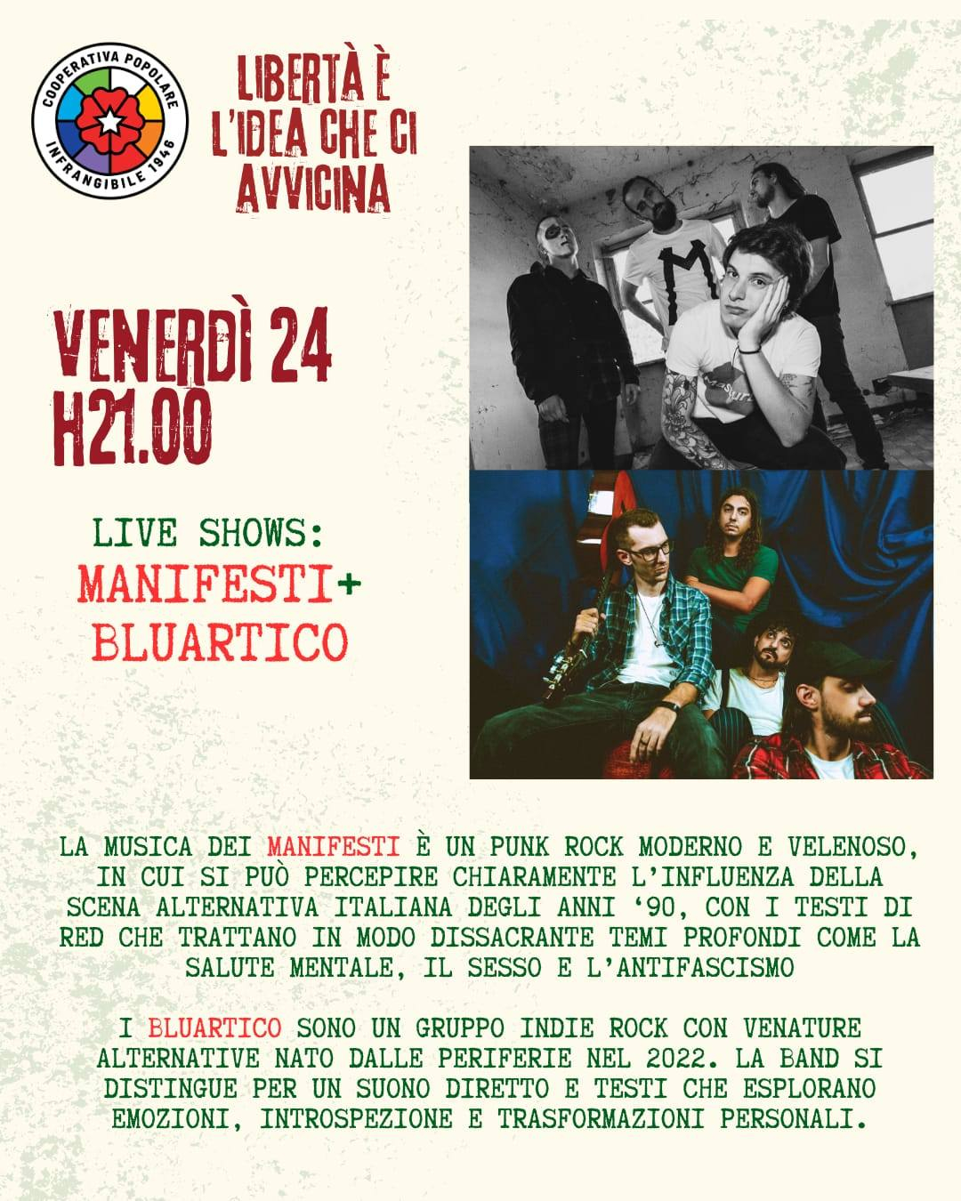 - Live show con Manifesti e Bluartico. I Manifesti portano un punk rock moderno con influenze della scena alternativa italiana, mentre i Bluartico propongono un indie rock dalle sonorità dirette e testi legati a emozioni e trasformazioni personali.