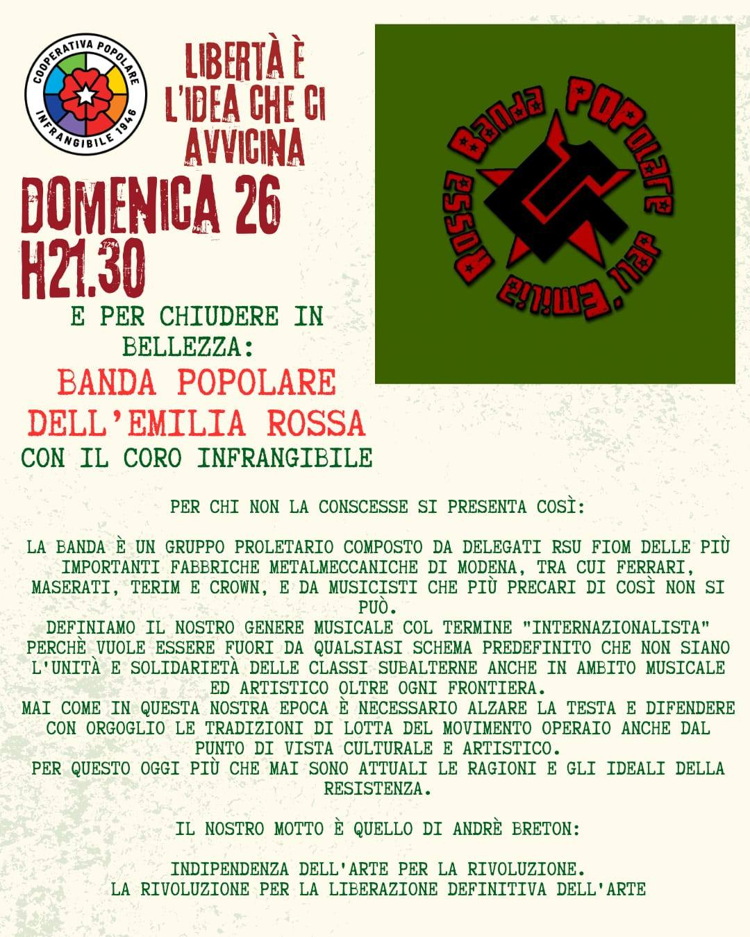 - Concerto della Banda Popolare dell’Emilia Rossa con il Coro Infrangibile, per la chiusura della manifestazione.