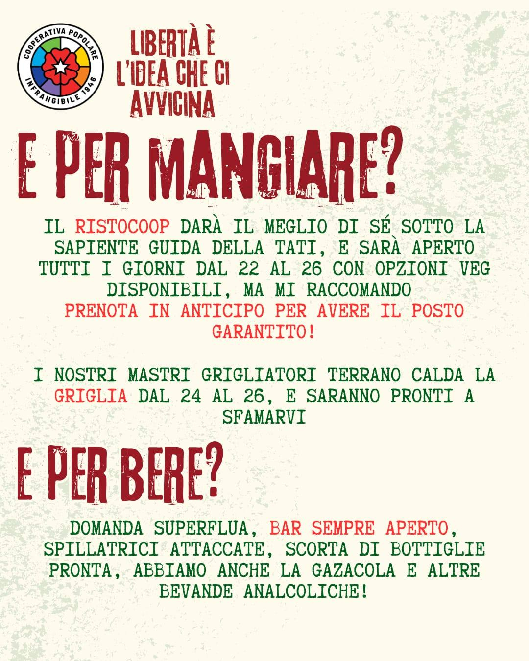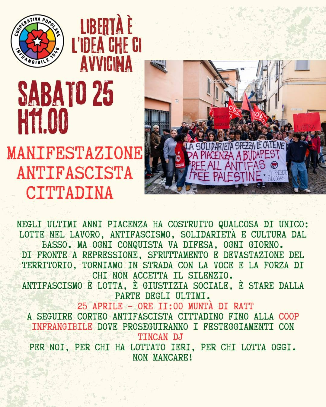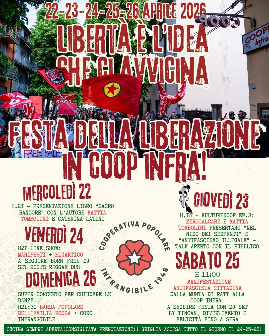 Da mercoledì 22 a domenica 26 aprile, alla Cooperativa Popolare Infrangibile di via Alessandria 16 a Piacenza, torna la Festa della Liberazione con cinque giorni di appuntamenti tra presentazioni, incontri, live show e dj set.