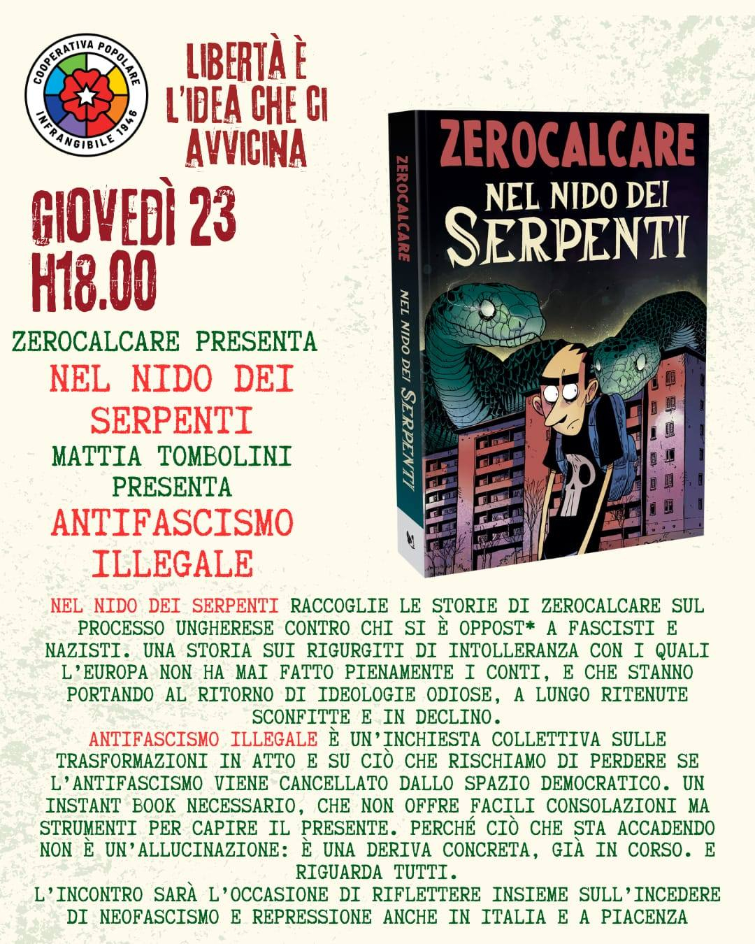 - KultureKoop ep.3: Zerocalcare e Mattia Tombolini presentano Nel nido dei serpenti e Antifascismo illegale, con talk aperto al pubblico. L’incontro affronta temi legati ai fenomeni di neofascismo e alle trasformazioni in atto nel contesto europeo e italiano.