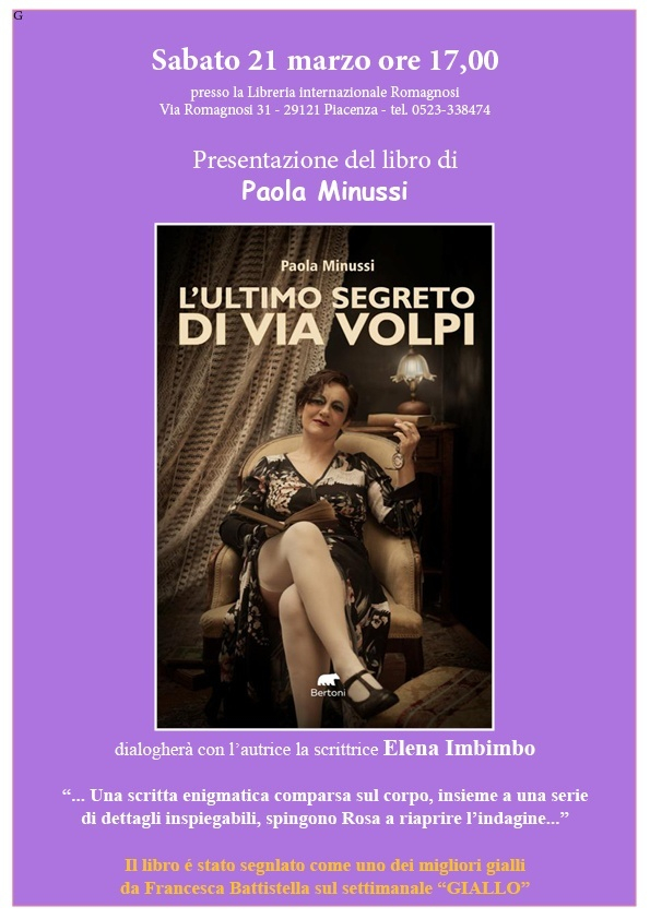 Sabato 21 marzo alle ore 17.00, presso la Libreria internazionale Romagnosi, si terrà la presentazione del libro L’ultimo segreto di Via Volpi di Paola Minussi.