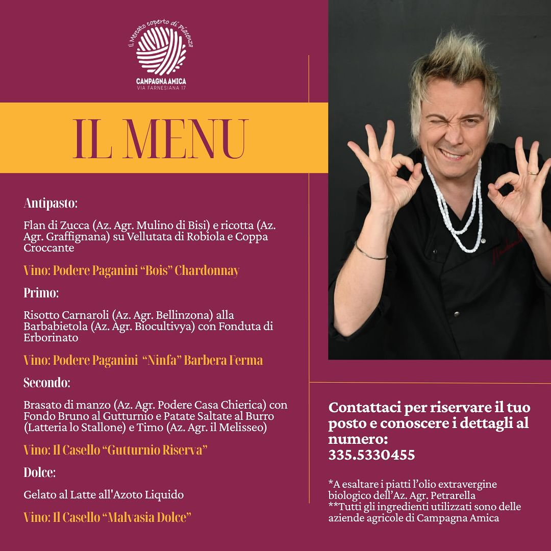 Il menù degustazione sarà realizzato con ingredienti provenienti dalle aziende agricole di Campagna Amica, valorizzando la qualità e la stagionalità dei prodotti del territorio.