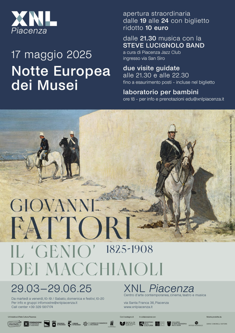 Sabato 17 maggioXNL Piacenza, Centro per le arti contemporanee della Fondazione di Piacenza e Vigevano, aderisce alla Notte europea dei Musei con un’apertura serale straordinaria, dalle 19.00 alle 24.00 (ultimo ingresso 23.20), della mostra “Giovanni Fattori 1825‑1908. Il ‘genio’ dei Macchiaioli”.