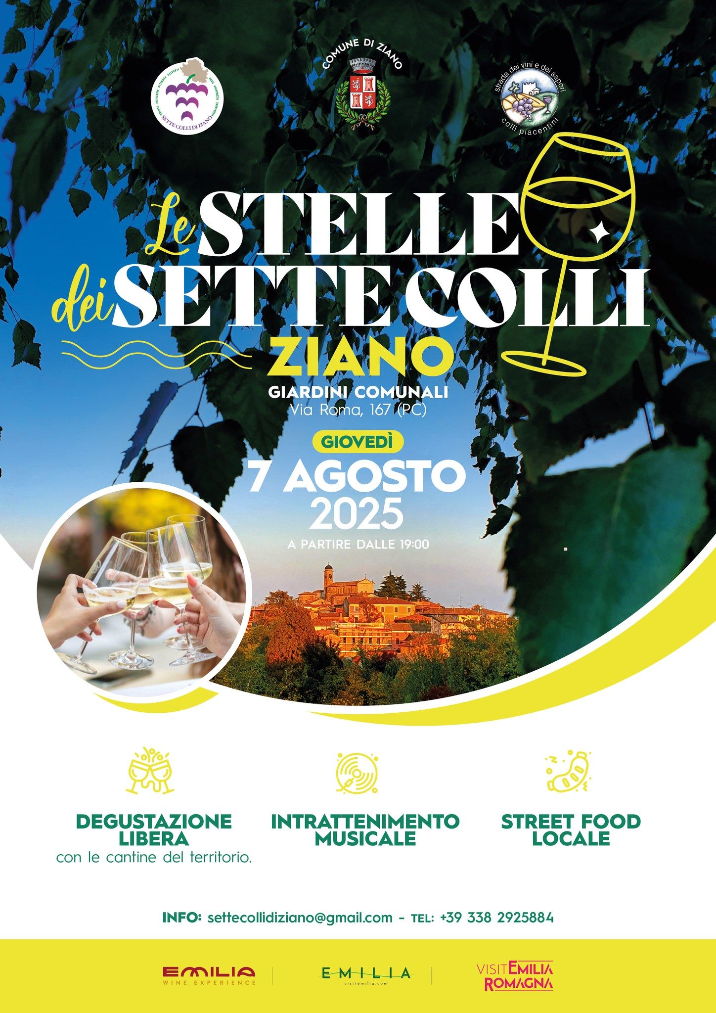 Giovedì 7 agosto, dalle 19.00 alle 24.00, i Giardini Comunali di Ziano Piacentino ospiteranno “Le Stelle dei Sette Colli”, una serata dedicata alla scoperta dei vini dei Colli Piacentini.