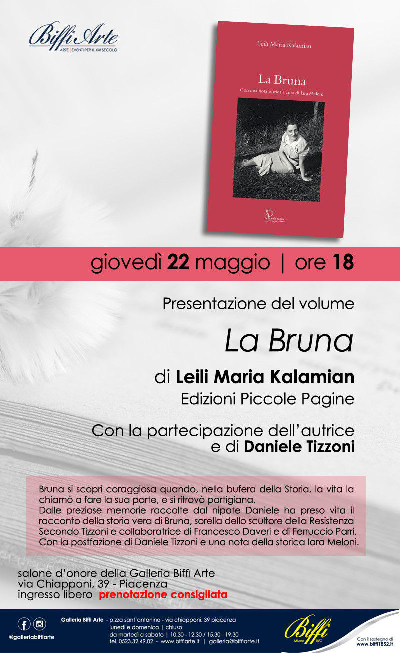 Giovedì 22 maggio, alle ore 18.00, il Salone d’Onore della Galleria Biffi Arte ospiterà la presentazione del volume La Bruna di Leili Maria Kalamian, pubblicato da Edizioni Piccole Pagine.