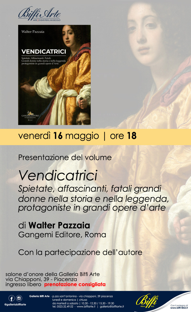 Venerdì 16 maggio, alle ore 18.00, il Salone d’Onore della Galleria Biffi Arte ospiterà la presentazione del volume Vendicatrici. Spietate. Affascinanti. Fatali. Grandi donne nella storia e nella leggenda protagoniste in grandi opere d’Arte di Walter Pazzaia e pubblicato da Gangemi Editore (Roma).