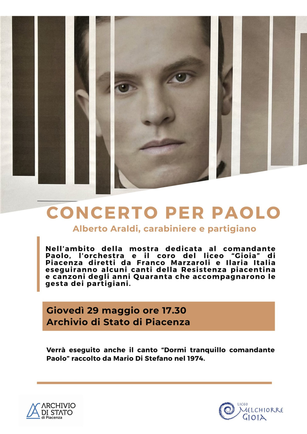 Giovedì 29 maggio alle ore 17.30, l'Archivio di Stato di Piacenza ospiterà il concerto "Concerto per Paolo", un evento dedicato al comandante Paolo nell'ambito della mostra a lui dedicata.