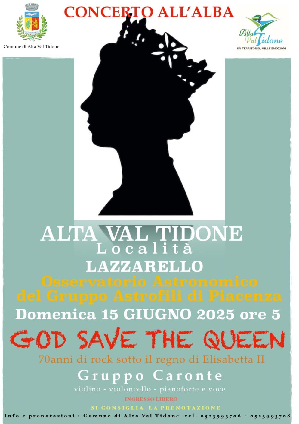 Domenica 15 giugno alle ore 5.00, presso l’Osservatorio Astronomico del Gruppo Astrofili di Piacenza, in località Lazzarello (Alta Val Tidone), si terrà God Save the Queen, concerto all’alba con il Gruppo Caronte.
