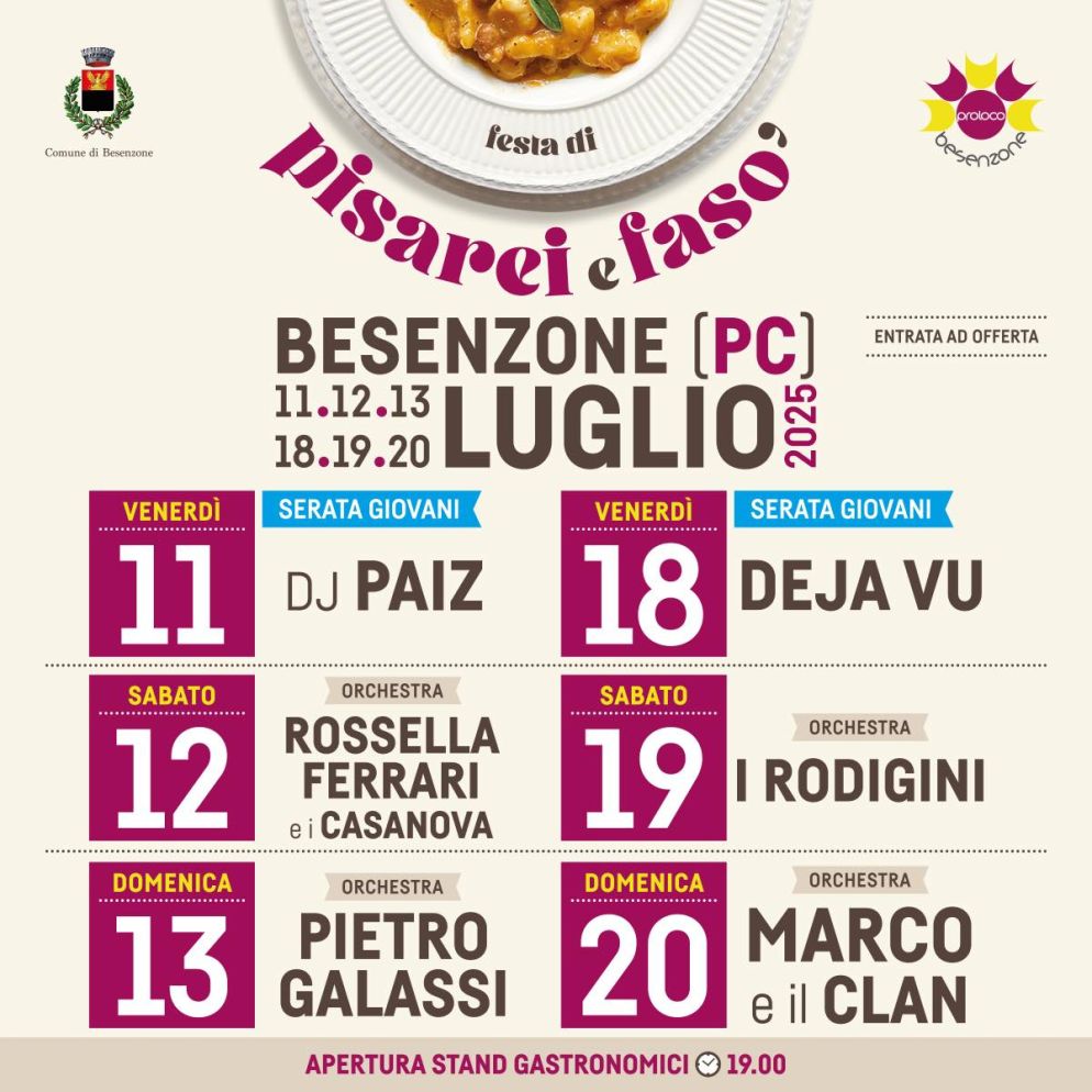 Da venerdì 18 a domenica 20 luglio torna a Besenzone il secondo fine settimana della Festa di Pisarëi e Fasö, la manifestazione gastronomica interamente dedicata a quello che è senza dubbio il piatto tipico più conosciuto del Piacentino.
