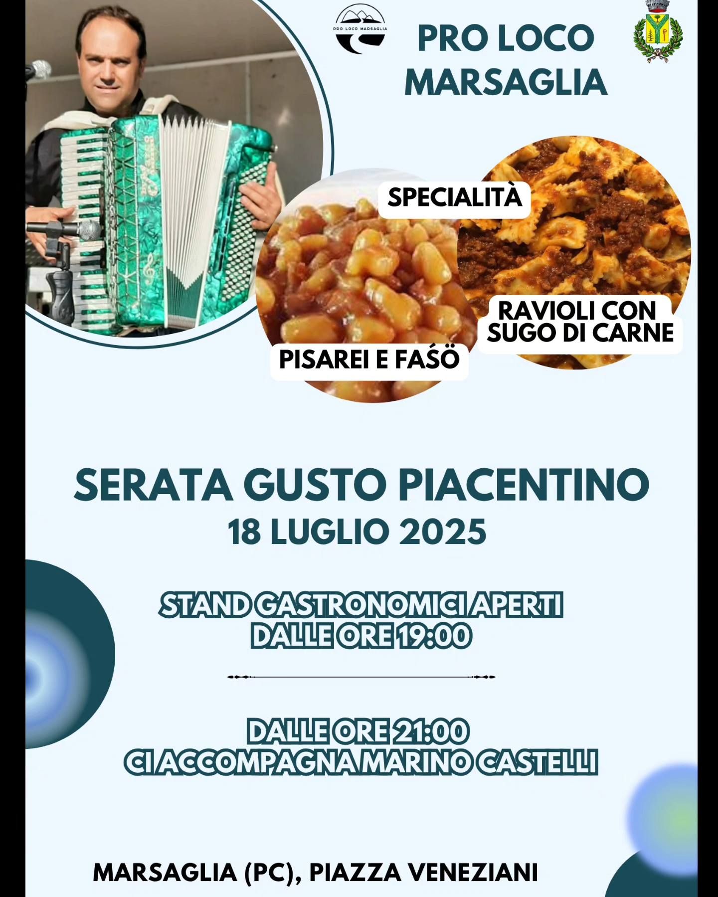 Venerdì 18 luglio a Marsaglia torna l’appuntamento con il buon cibo e il divertimento grazie alla “Serata gusto piacentino”, organizzata dalla Pro Loco di Marsaglia.