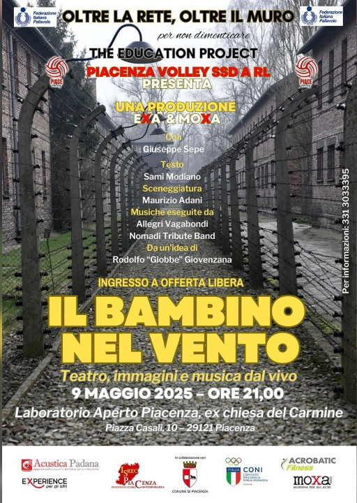 Venerdì 9 maggio alle ore 21.00, presso il Laboratorio Aperto Ex Chiesa del Carmine (Piazza Casali, 10), si terrà lo spettacolo teatrale "Il bambino nel vento", realizzato dagli studenti del biennio delle scuole superiori appartenenti alla società sportiva Piacevolley.