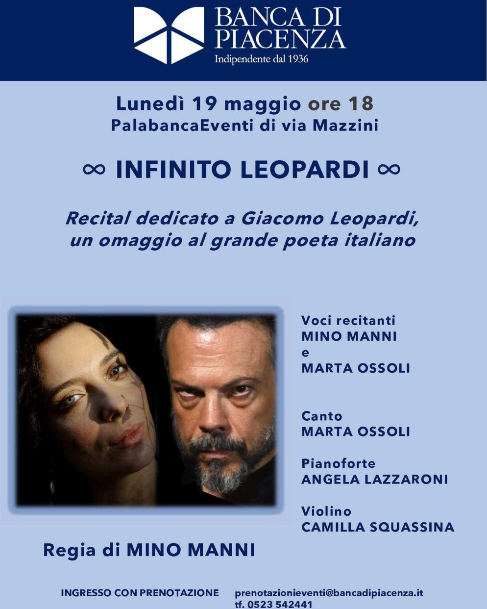 Lunedì 19 maggio alle ore 18.00, presso il PalabancaEventi di via Mazzini a Piacenza, si terrà Infinito Leopardi, un recital dedicato alla figura e all’opera di Giacomo Leopardi.