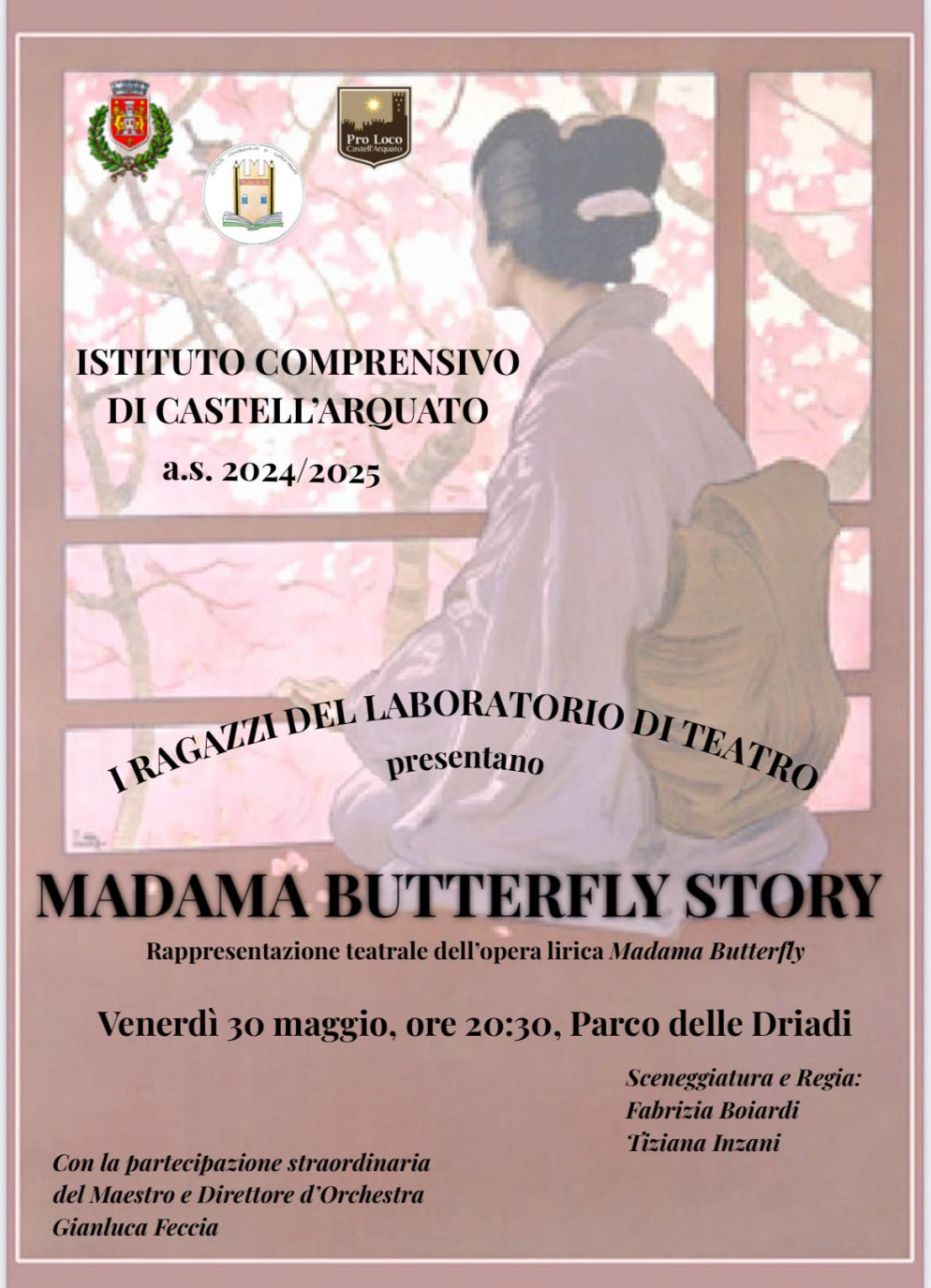 Venerdì 30 maggio alle ore 20.30, il Parco delle Driadi di Castell'Arquato ospiterà una nuova rappresentazione dei Ragazzi del Laboratorio di Teatro, che porteranno in scena Madama Butterfly Story, rilettura teatrale dell'opera lirica MadamaButterfly.