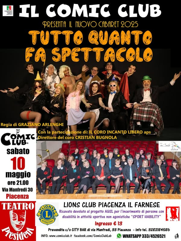 Sabato 10 maggio, alle ore 21.00, il Teatro President di Piacenza ospita Tutto quanto fa spettacolo, una serata all’insegna del divertimento e della solidarietà, tra intrattenimento e musica d’autore.