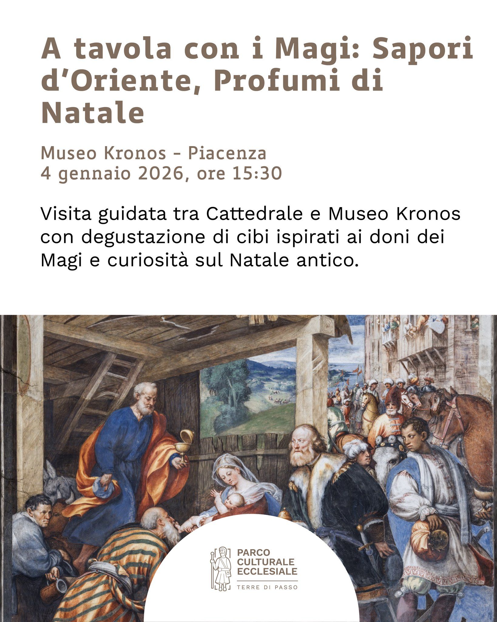 Al termine della visita, i partecipanti saranno accompagnati in un piccolo viaggio sensoriale tra profumi e sapori d’Oriente: datteri, fichi, frutta secca, dolci speziati e miele offriranno l’occasione di riscoprire alimenti che evocano la terra d’origine dei Magi e il simbolismo del Natale antico.