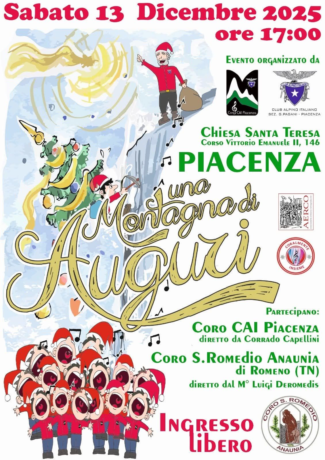 Sabato 13 dicembre, alle ore 17.00, presso la Chiesa di Santa Teresa in Corso Vittorio Emanuele II 146 a Piacenza, si terrà il tradizionale concerto natalizio organizzato dal Coro CAI Piacenza in collaborazione con il Club Alpino Italiano – Sezione G.Pagani.