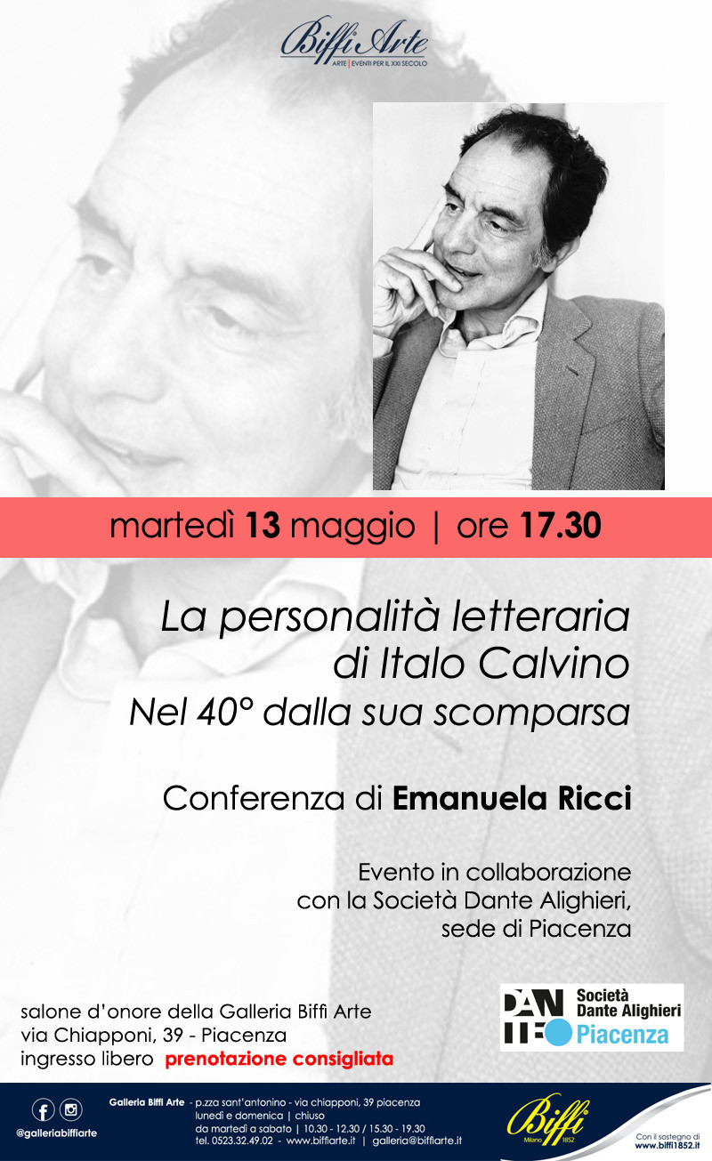Martedì 13 maggio, alle ore 17.30, il Salone d’Onore della Galleria Biffi Arte ospiterà la conferenza "La personalità letteraria di Italo Calvino", a cura di Emanuela Ricci, in occasione del quarantesimo anniversario della scomparsa dello scrittore.