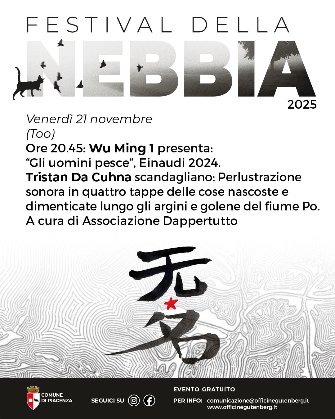 Venerdì 21 novembre, alle ore 20.45, presso l'Hub di Comunità Too, si terrà un nuovo appuntamento del Festival della Nebbia 2025 con Wu Ming 1, che presenterà il suo libro Gli uomini pesce (Einaudi, 2024), un racconto che attraversa il paesaggio del Po e le sue storie sommerse, tra ambientalismo, memoria e immaginari fluviali.