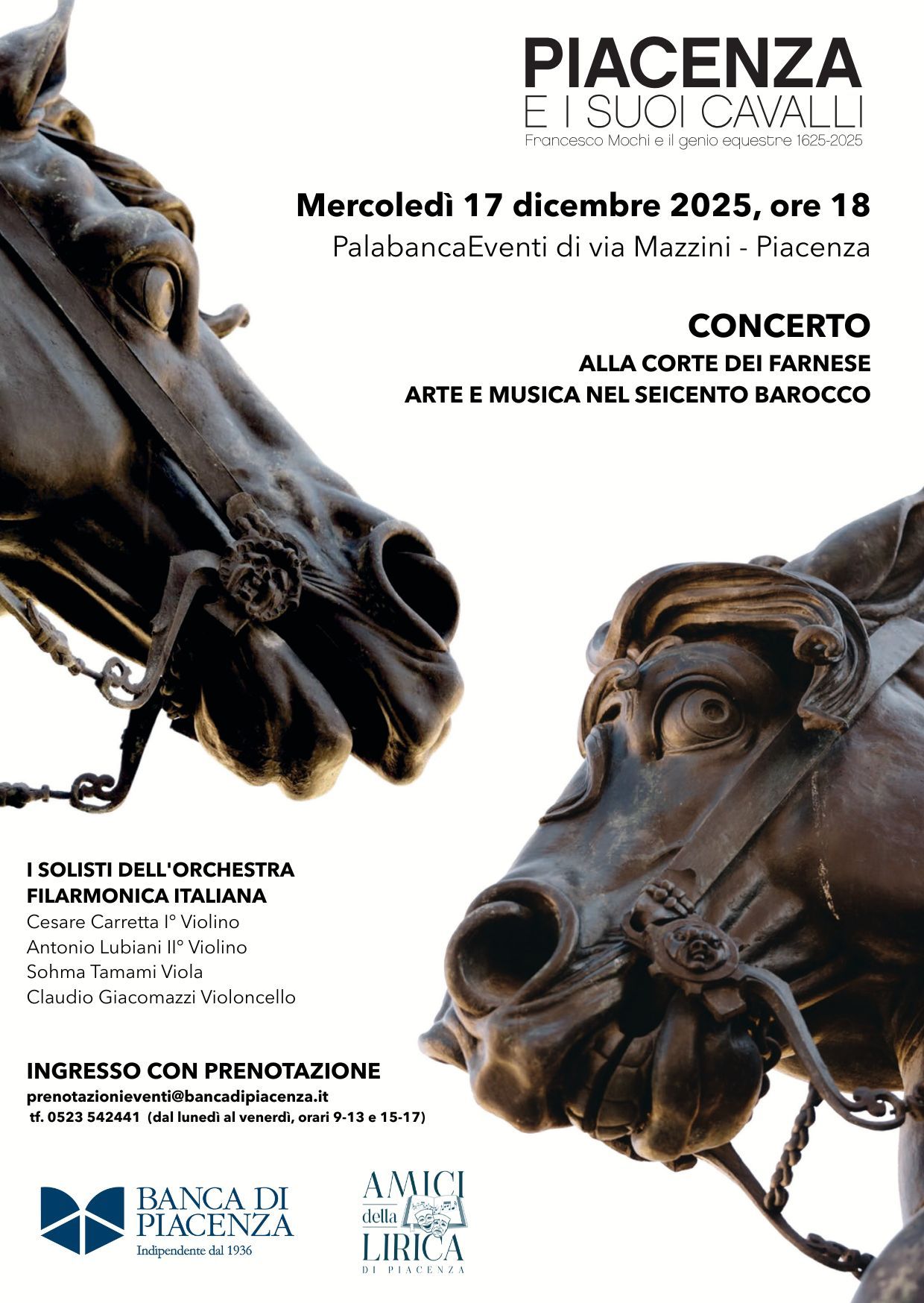 Mercoledì 17 dicembre, alle ore 18.00, a PalabancaEventi di Piacenza, è in programma Alla corte dei Farnese: arte e musica nel Seicento Barocco, evento fuori programma che propone un percorso musicale tra le suggestioni del Seicento barocco e le atmosfere della corte farnesiana.