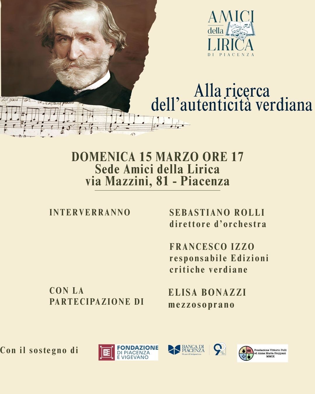 Domenica 15 marzo alle ore 17.00, la Sede degli Amici della Lirica di Piacenza ospita l’incontro “Alla ricerca dell’autenticità verdiana”, un appuntamento dedicato alla figura e al linguaggio musicale di Giuseppe Verdi.