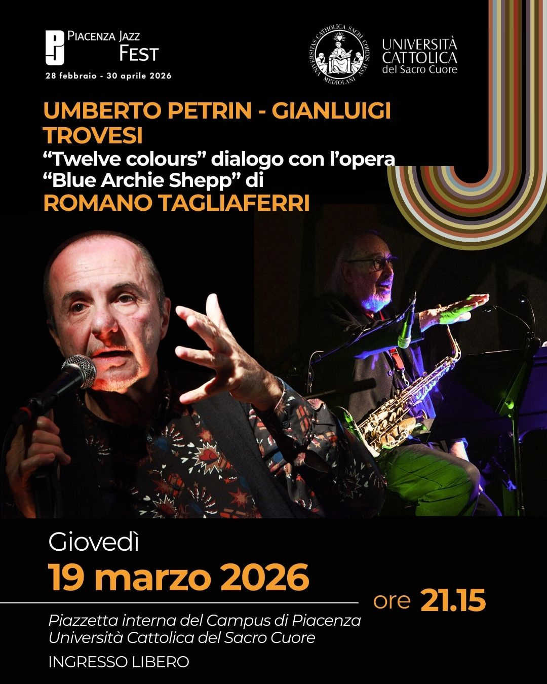 Giovedì 19 marzo alle ore 21.15, all’Università Cattolica del Sacro Cuore di Piacenza, appuntamento con Gianluigi Trovesi e Umberto Petrin e il progetto "Twelve Colours" per il Piacenza Jazz Fest.
