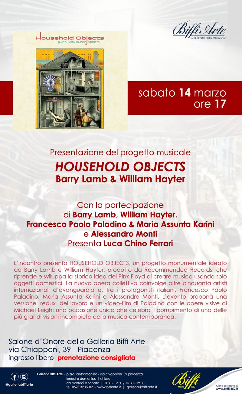 Sabato 14 marzo, alle ore 17.00, nel Salone d’Onore della Galleria Biffi Arte, sarà presentato "Household Objects", progetto musicale ideato da Barry Lamb e William Hayter.