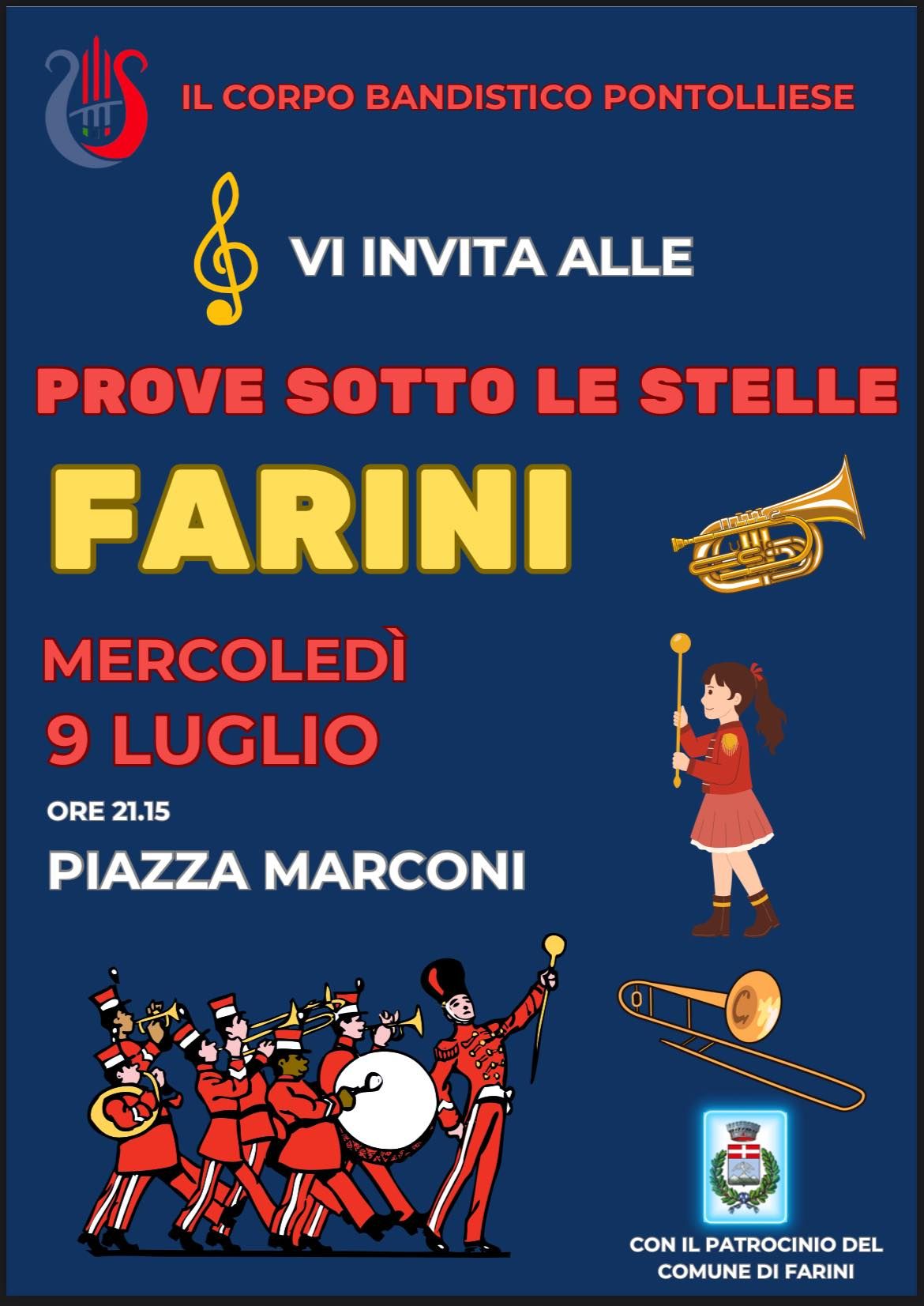 Il Corpo Bandistico Pontolliese si esibirà a Farini con le “Prove sotto le stelle”, in programma mercoledì 9 luglio alle ore 21.15 in Piazza Marconi.