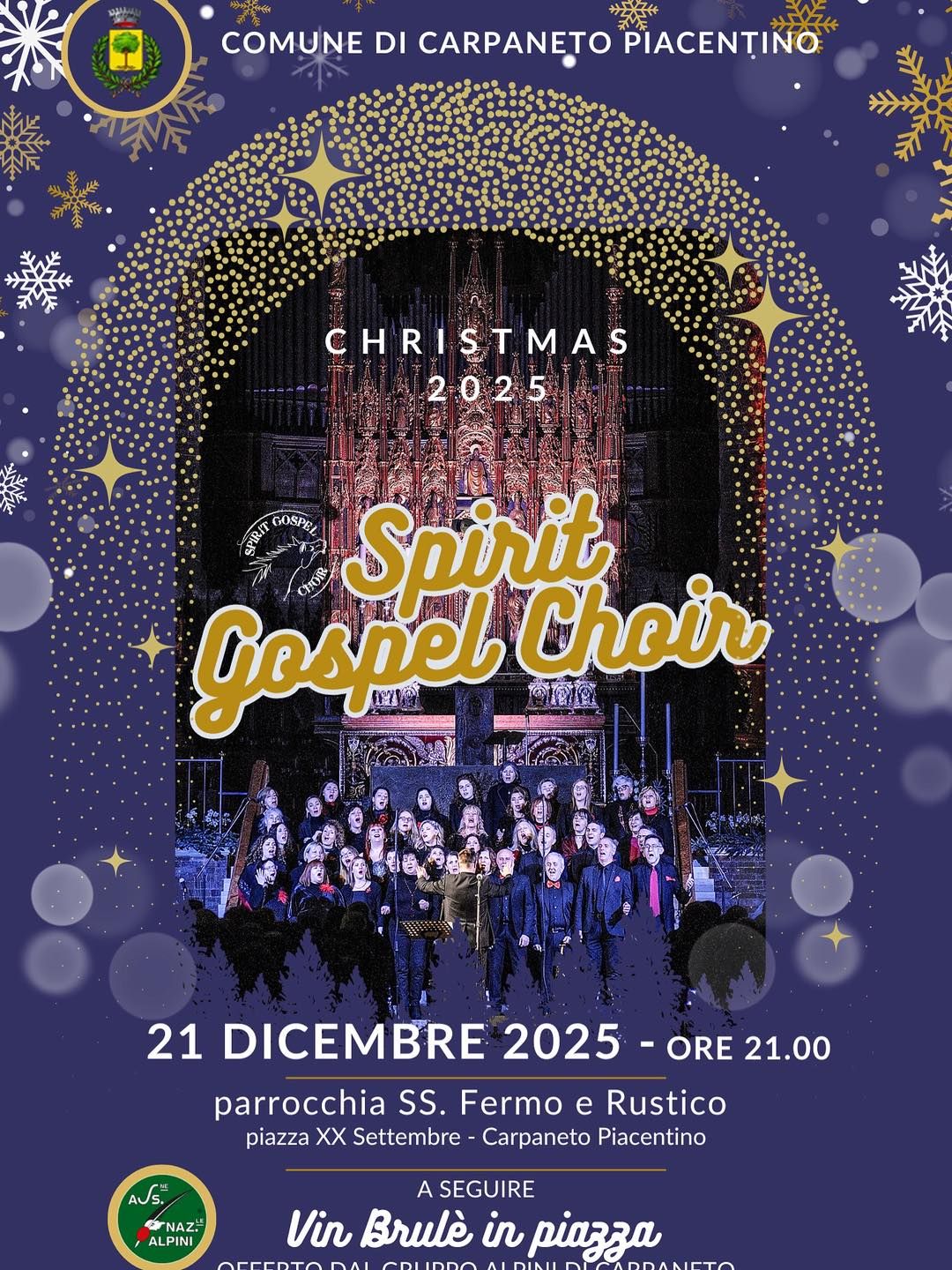 Domenica 21 dicembre, alle ore 21.00, la Parrocchia di SS. Fermo e Rustico, in piazza XX Settembre a Carpaneto Piacentino, ospita l'ultima tappa del Christmas Tour 2025 dello Spirit Gospel Choir.