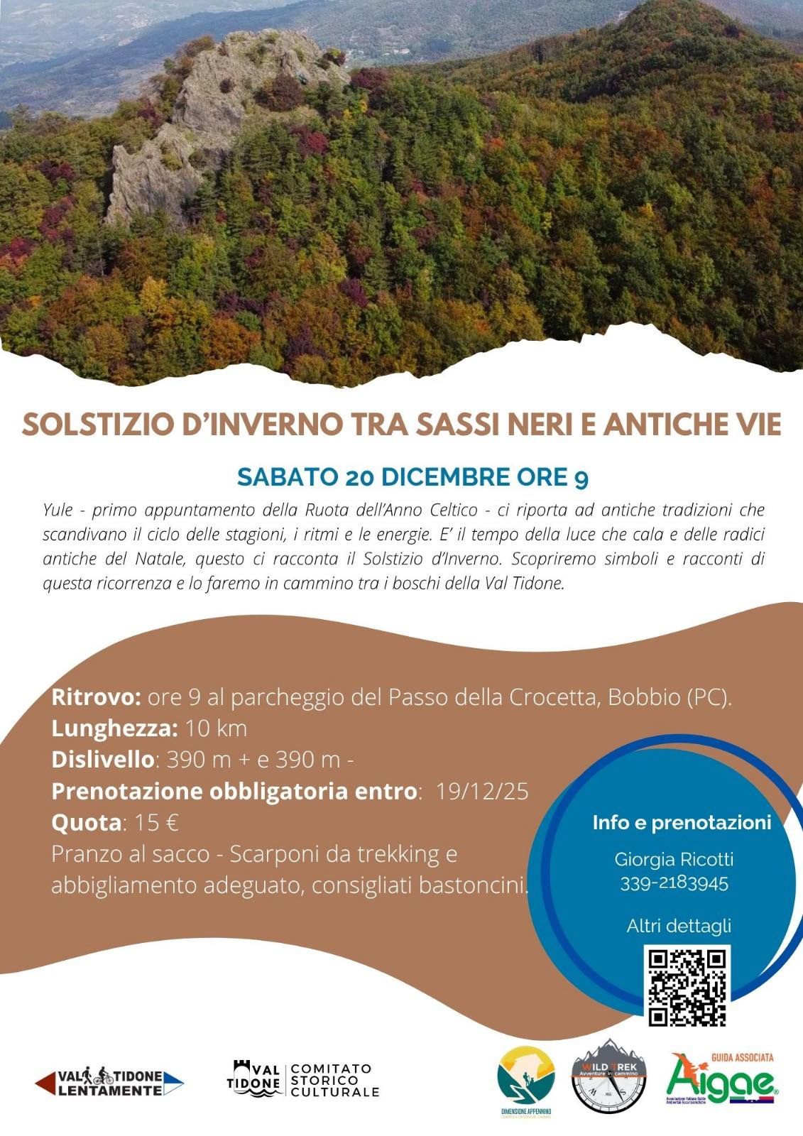 Sabato 20 dicembre è in programma “Solstizio d’Inverno tra sassi neri e antiche vie”, un’escursione guidata nei boschi della Val Tidone per celebrare Yule, il primo appuntamento della Ruota dell’Anno Celtico.