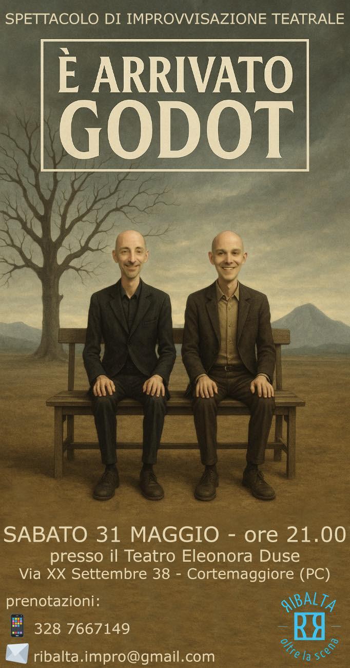 Sabato 31 maggio alle ore 21.00 il Teatro Eleonora Duse di Cortemaggiore ospiterà "È arrivato Godot", spettacolo di improvvisazione teatrale messo in scena dalla compagnia Ribalta di Piacenza, con Maurizio Bronzini e Paolo Gogni.