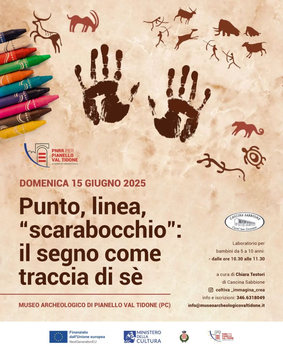 Domenica 15 giugno, presso il Museo Archeologico di Pianello Val Tidone, si terrà un laboratorio creativo dedicato ai più piccoli: "Punto, linea, 'scarabocchio': il segno come traccia di sé".
