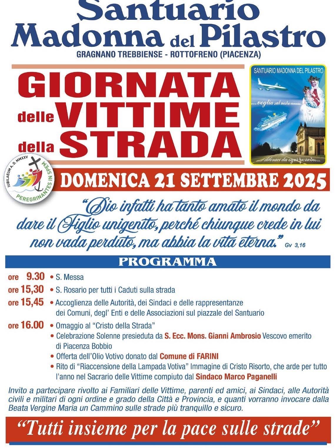 Domenica 21 settembre, presso il Santuario della Madonna del Pilastro a Gragnano Trebbiense si terrà la Giornata delle vittime della strada, un momento di memoria e riflessione dedicato a quanti hanno perso la vita in incidenti stradali.