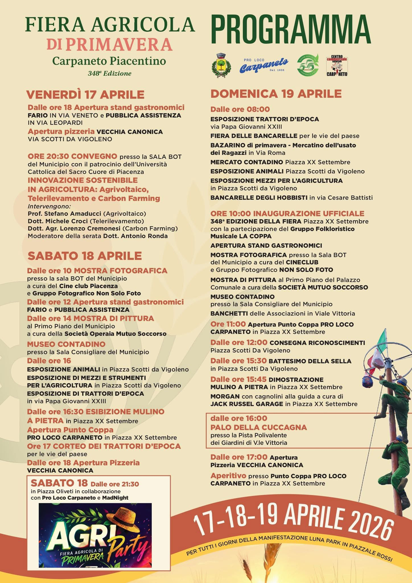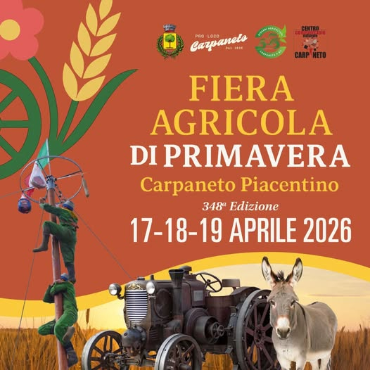 Dal 17 al 19 aprile Carpaneto Piacentino accoglie una nuova edizione della tradizionale Fiera Agricola di Primavera, tra gli appuntamenti più radicati del territorio.