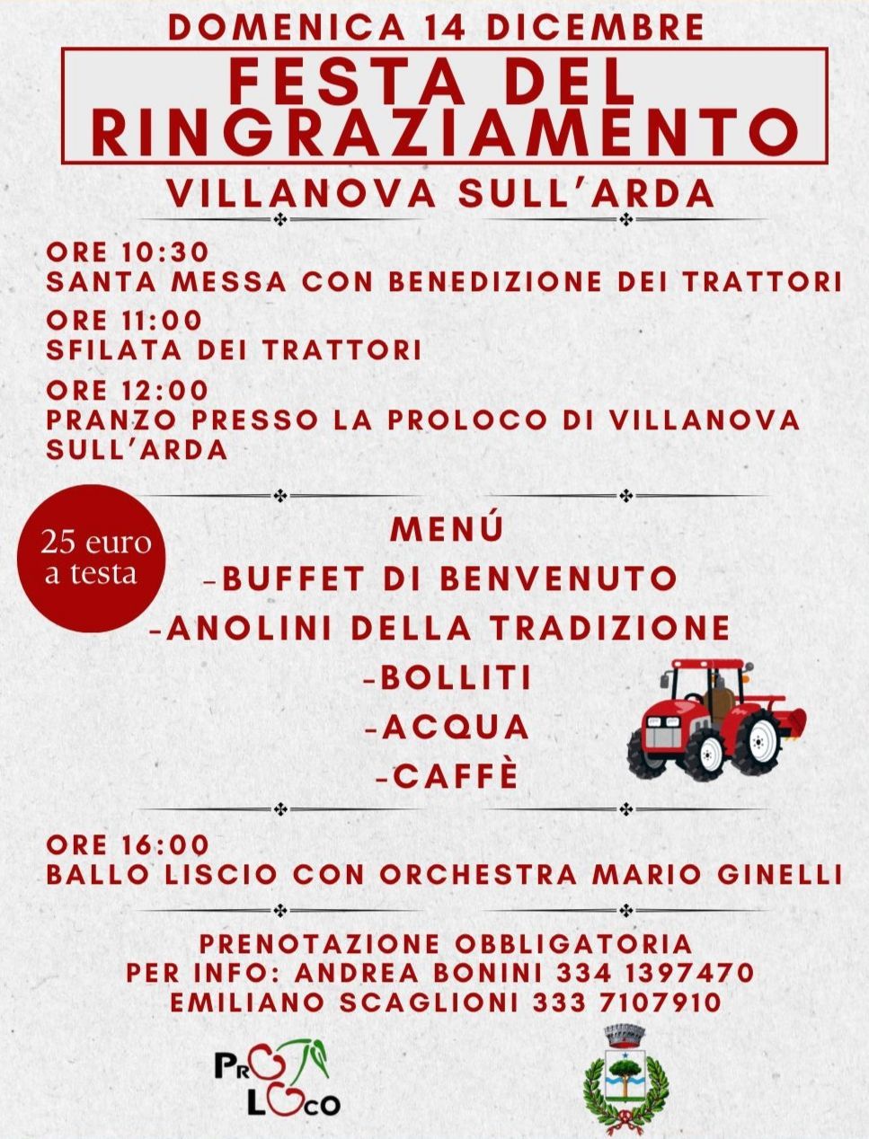 Domenica 14 dicembre Villanova sull’Arda celebra la tradizionale Festa del Ringraziamento, una giornata dedicata al mondo agricolo, alla convivialità e alle tradizioni del territorio.