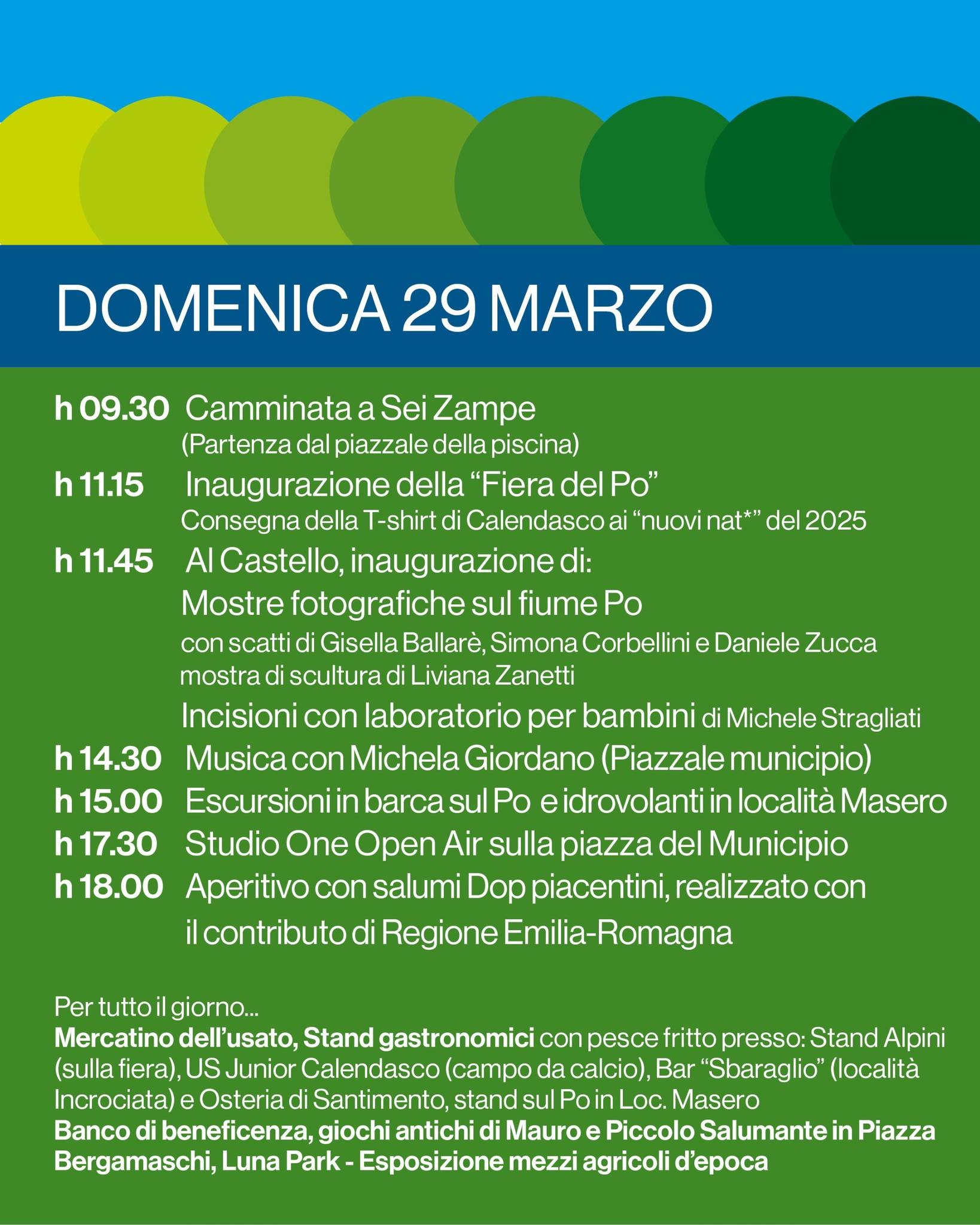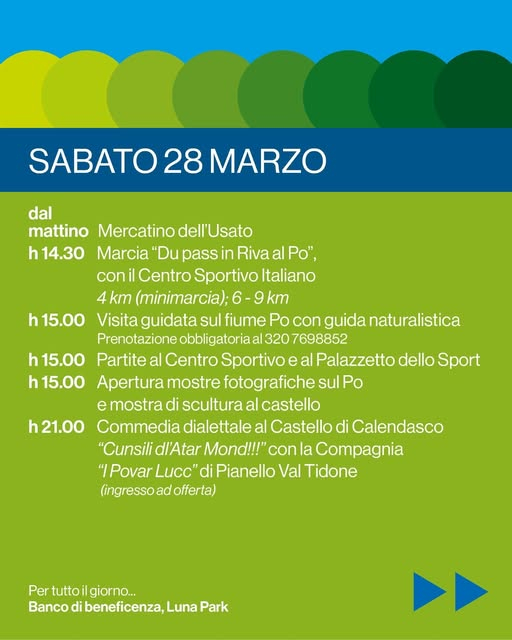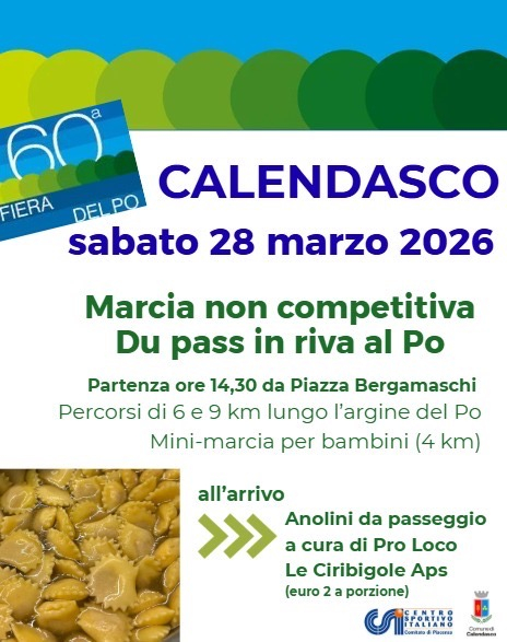 Ore 14.30 - Marcia "Du Pass in riva al Po" con il Centro Sportivo Italiano - 4 km (mini marcia); 6 - 9 km. All'arrivo anolini da asporto a cura della Pro Loco Le Ciribigole Aps.