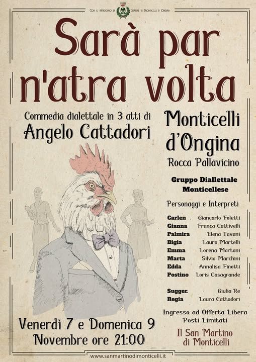 - Ore 21.00, Rocca Pallavicino – “Sarà par n’atra volta”, commedia dialettale in tre atti di Angelo Cattadori, a cura del Gruppo Dialettale Monticellese. Ingresso a offerta libera