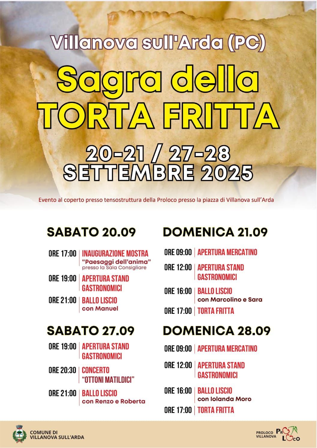 Sabato 27 e domenica 28 settembre, a Villanova sull’Arda, torna la tradizionale Sagra della Torta Fritta, un weekend di gusto, musica e divertimento per tutti.