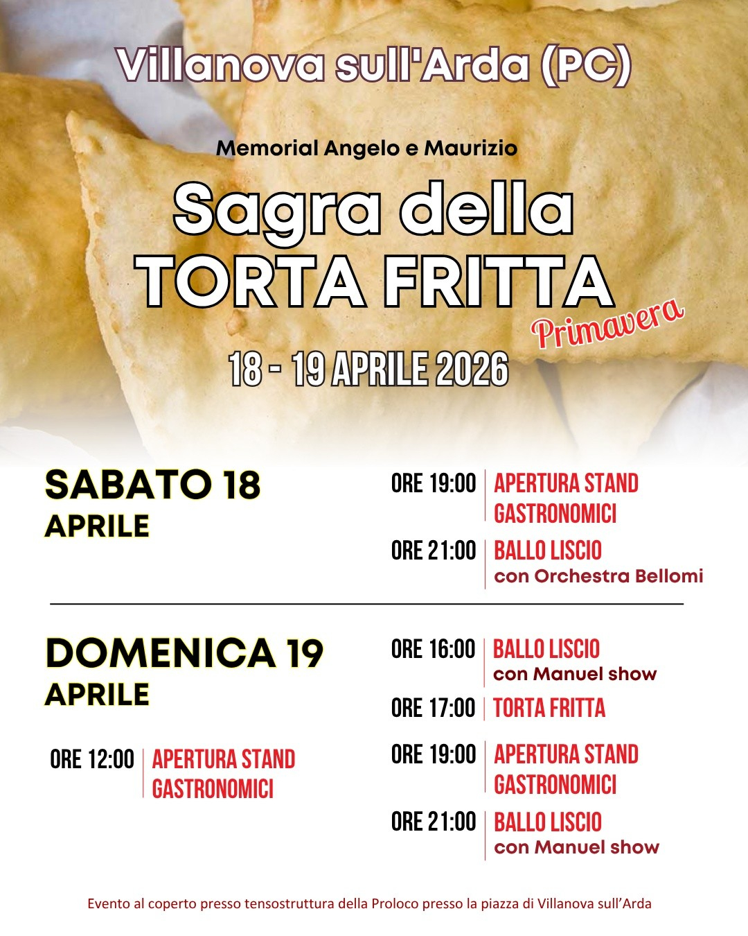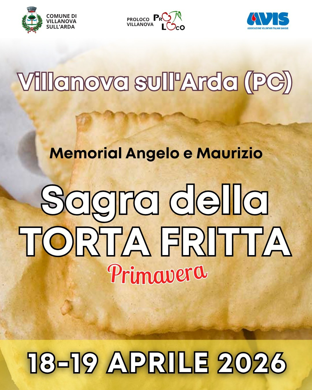Sabato 18 e domenica 19 aprile, a Villanova sull’Arda, torna la tradizionale Sagra della Torta Fritta, un weekend di gusto, musica e divertimento per tutti.