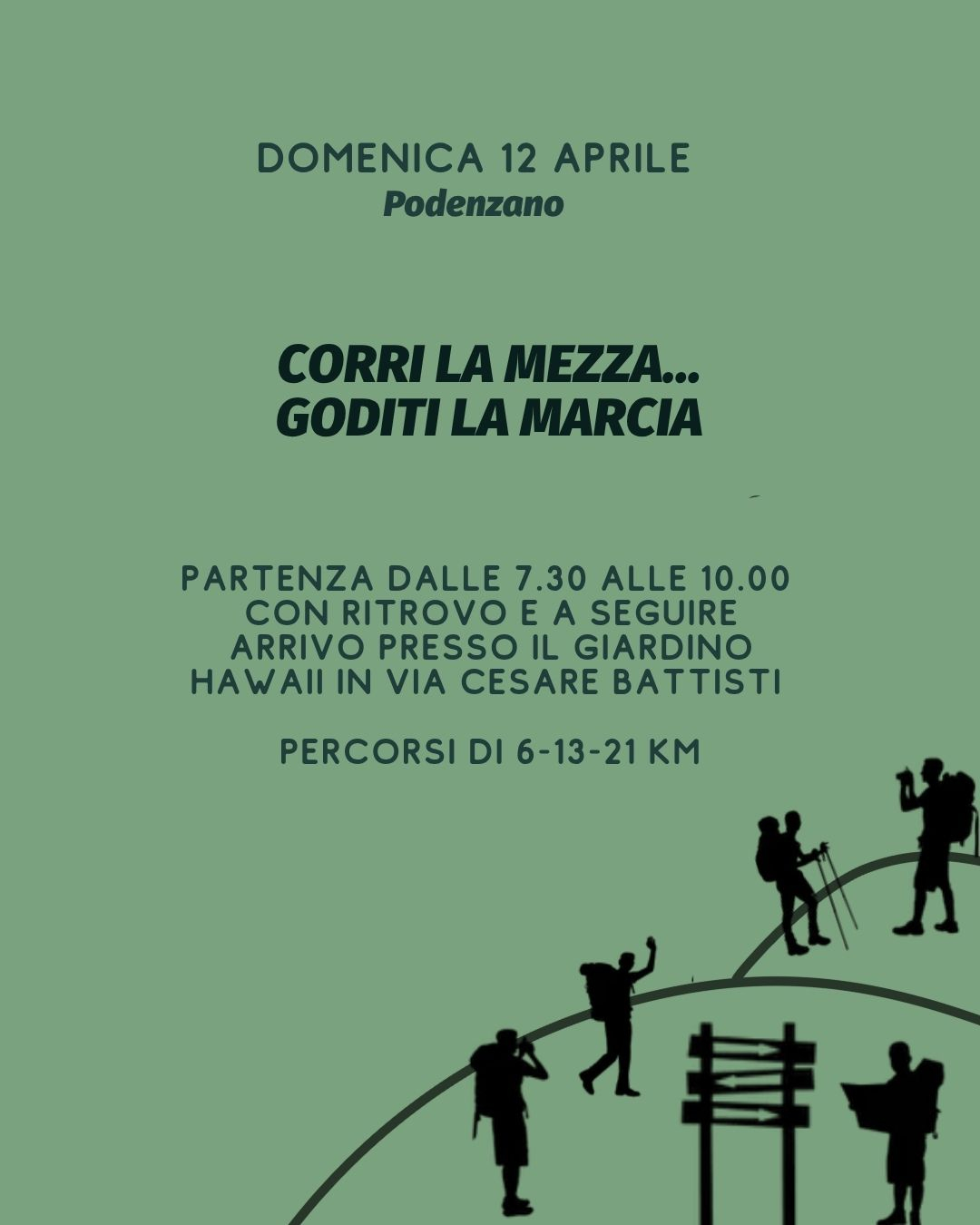 Il Comune di Podenzano con la collaborazione del gruppo G.M. Gelindo Bordin organizza, per domenica 12 aprile, la marcia "Corri la mezza... Goditi la marcia", evento ludico motorio non competitivo a passo libero e aperto a tutti con percorsi di Km 6 - 13 - 21.