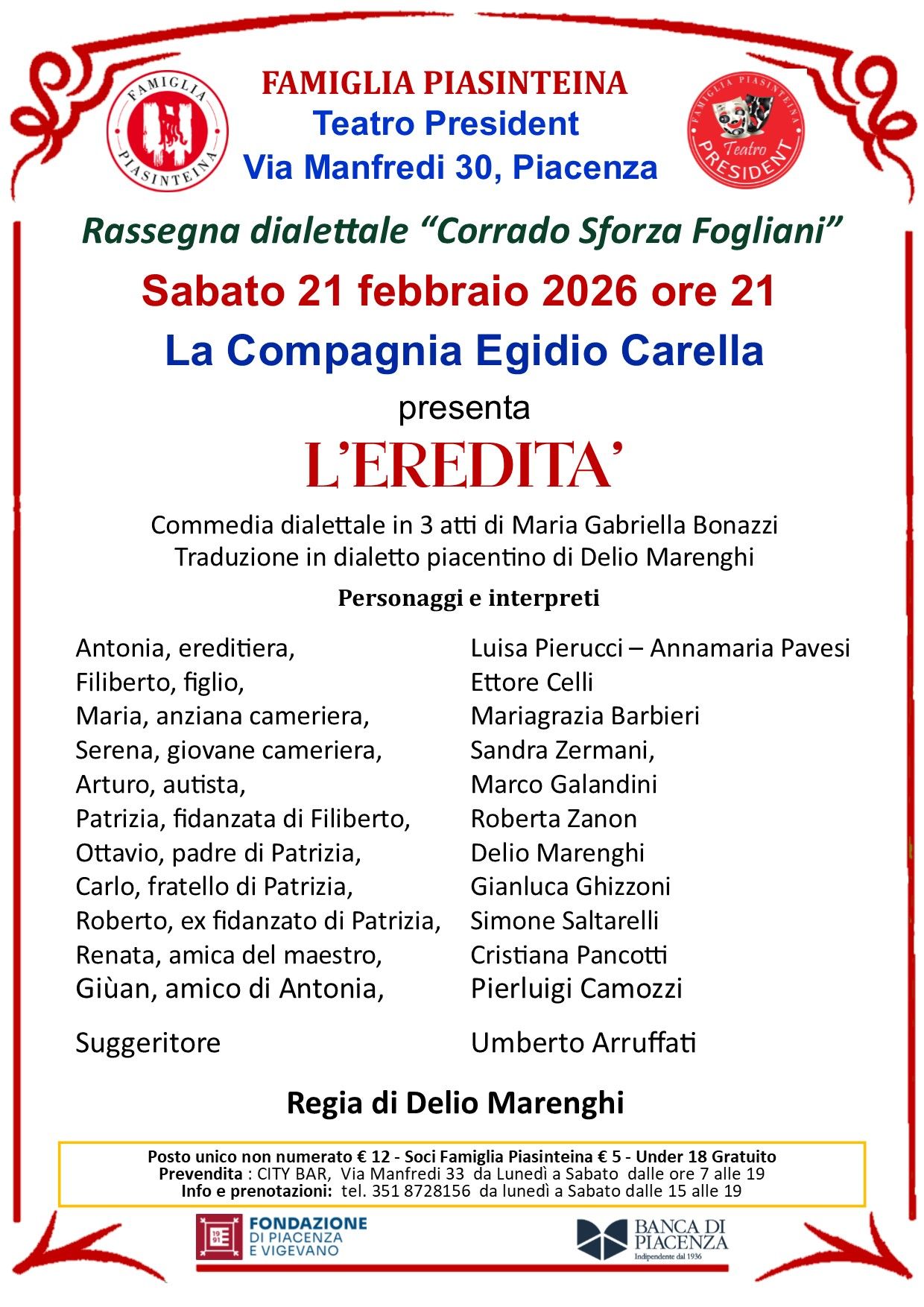 Sabato 21 febbraio alle ore 21.00 al Teatro President va in scena "L’eredità", tre atti comici di Maria Gabriella Bonazzi, nell’ambito della Rassegna dialettale Corrado Sforza Fogliani organizzata dalla Famiglia Piasinteina in collaborazione con la Banca di Piacenza e la Fondazione di Piacenza e Vigevano.