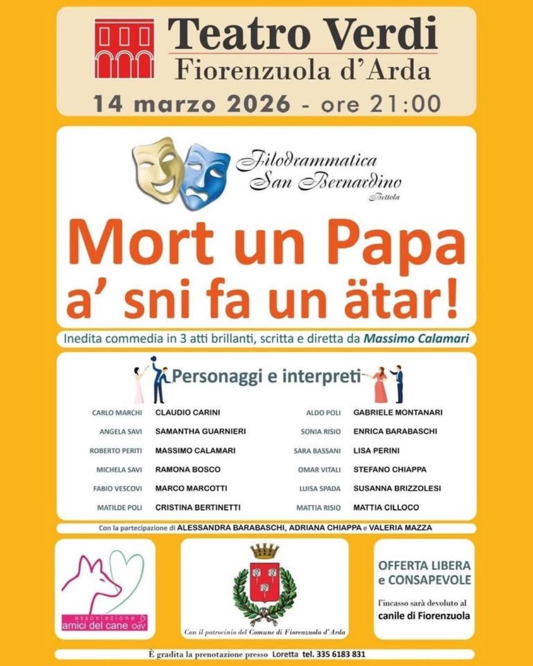 Sabato 14 marzo, il Teatro Verdi di Fiorenzuola ospita la Filodrammatica San Bernardino con la commedia dialettale “Mort un Papa a’sni fa un ätar!”.