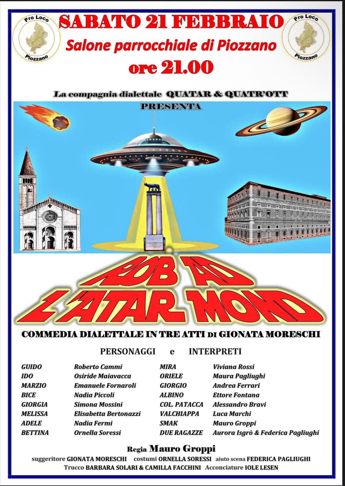 Sabato 21 febbraio alle ore 21.00, presso il Salone parrocchiale di Piozzano, va in scena la Compagnia dialettale Quatar & Quatr’ott, che presenta “Rob ad l’ätar mond”, commedia dialettale inedita in tre atti di Gionata Moreschi, con la regia di Mauro Cammi.